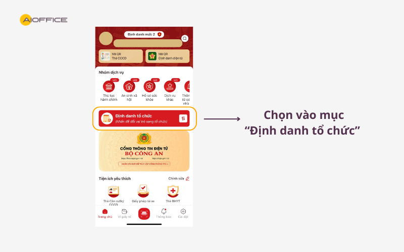 Bước 1: Người đại diện theo pháp luật, người đứng đầu doanh nghiệp hoặc người được ủy quyền sử dụng tài khoản định danh điện tử mức độ 02 của mình trên ứng dụng VNeID, chọn mục “Định danh tổ chức”