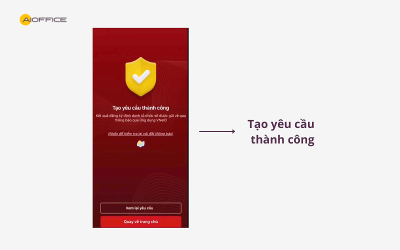 Bước 8: Tạo yêu cầu thành công, kết quả đăng ký định danh tổ chức sẽ được gửi về qua thông báo ứng dụng VNeID