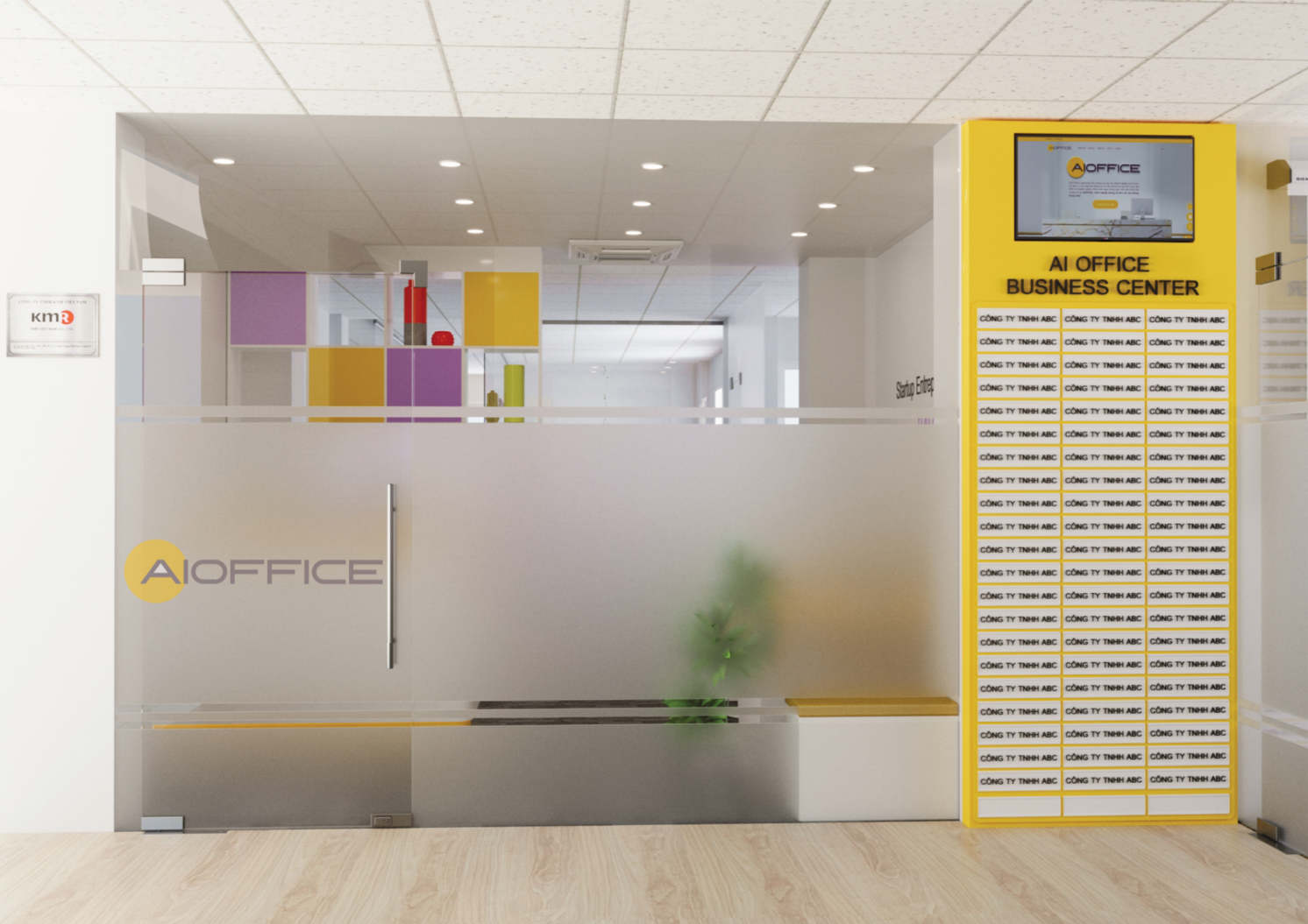 Khu vực treo bảng tên vật lý và điện tử trước văn phòng Ai Office