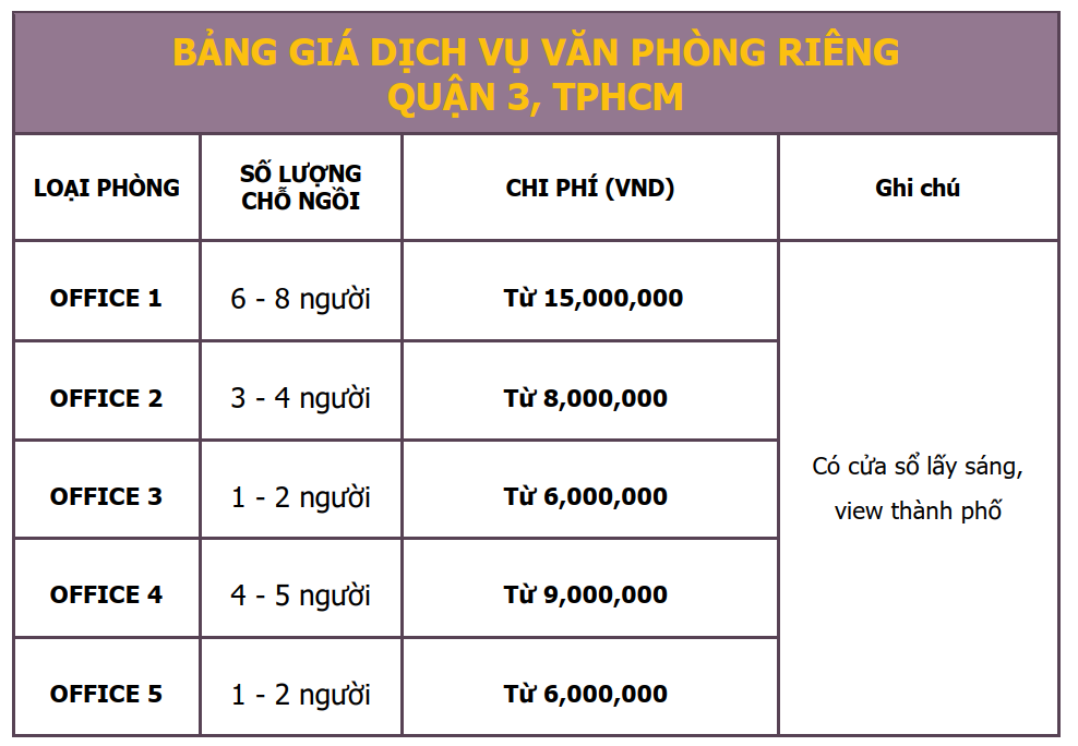 BẢNG GIÁ DỊCH VỤ VĂN PHÒNG RIÊNG TRỌN GÓI TẠI QUẬN 3